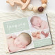 Simples anúncio de nascimento moderno para compartilhar a notícia da chegada do seu bebê. A frente verde suave apresenta uma colagem de 4 fotos com o nome do bebê em uma tipografia branca moderna. Todos os outros detalhes chave, incluindo data de nascimento, estatísticas de nascimento, nomes de pais estão em uma simples tipografia branca. O reverso é coordenado num verde correspondente