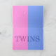 Simples bebê moderno e garota gêmeos fraternos anunciando saudação de cartão cor dentro superior e inferior é rosa e azul com a palavra TWINS em contraste rosa e azul