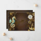 Fundo de madeira castanho com fundo marinho, cordilheira mecânica, volante antigo, âncora de ouro e diversas engrenagens de ouro e latão. Estilo Steampunk.