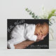 Personalize este anúncio de nascimento com as estatísticas de natalidade e fotos do seu bebê. Este cartão foi projetado para um menino com tipografia de guião branca. Deixe seu garotinho cumprimentar o mundo com este adorável anúncio de nascimento.