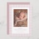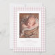 Apresente seu novo bebê com este doce e simples anúncio de nascimento de gingham rosa. A frente do clássico design apresenta um quadro de cheques cor-de-rosa e brancos com uma foto vertical solteiro junto com o tipo personalizável e grande espaço para o nome do bebê, data de nascimento, estatísticas e muito mais. O verso é um cor-de-rosa rosa empoeirado coordenado com pontos brancos e oferece espaço para uma segunda foto. Esta design faz parte da coleção de gingham "oh baby" de Lea Delaveris Design e também está disponível em outras cores e como um download digital de anúncio de nascimento. Encontre peças de coordenação como envelopes, invólucros, notas de agradecimento e muito mais na coleção.