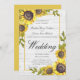 Girassóis em madeira branca: convite para casamento. Este Autumn Floral é simples, mas elegante e perfeito para um casamento de na moda. A design neutra apresenta uma placa minimalista decorada com um spray romântico de girassóis com fundo branco de madeira.