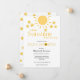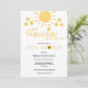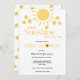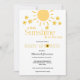 Escrito minimalista que nosso sol está a caminho, Anúncio de chá de fraldas de flor de margarida sunshine, simples cartão de convite para chás de fraldas dos anos 70.