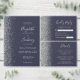 A borda esquerda deste elegante casamento moderno salve o cartão de data apresenta uma borda cintilante. O texto personalizável combina a escrita manual de cinzas prateadas, fontes copperplate e itálico em um fundo azul escuro. O verso apresenta um design azul e prateado correspondentes.