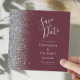 A borda esquerda deste elegante casamento moderno salve o cartão de data apresenta uma borda cintilante. O texto personalizável combina a escrita manual de cinzas prateadas, fontes em copperplate e itálico em um fundo burgundy. O lado inverso apresenta uma burgundy e uma design prateada correspondentes.