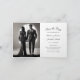This gothic wedding save the date folded card features a skeleton couple wearing a wedding outfit with red roses and candles in a romantic setting in front of a lake at night with the moon in the background. The inside of the card has a photo for you to change to your own and your wedding details on the right for you to personalizes. Image generated with AI.