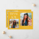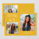 Cartão de foto de anúncio de graduação moderno e caprichoso com 2 fotos na frente e 1 no verso. O texto diz "OBRIGADO" com estrelas cintilantes. Adicione o nome do graduado, informações e mensagem para personalizar este cartão. Amarelo.