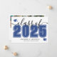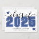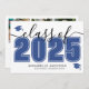 Um anúncio clássico, porém moderno, de graduação horizontal. A frente apresenta um "2025" sobredimensionado em azul-negrito com "Classe de" em preto-elegante, acentuado por um roteiro preto elegante. Dois ícones azuis de boné de formatura acrescentam um toque comemorativo, com espaço abaixo para o nome do formando e a escola. As cores podem ser personalizadas para corresponder às cores da escola para uma aparência personalizada. O verso mostra uma colagem de fotos com três pontos de imagem e espaço para uma mensagem sincera dos pais, destacando realizações e expressando orgulho.