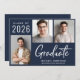 Anúncio de graduação em azul-marinho escuro moderno com 3 fotos e "Formando" em um roteiro branco ousado contemporâneo. Adicione o nome do formando, ano de aula e escola ou universidade em tipografia branca simples.