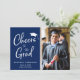 Cartão de anúncio de graduação de fotos moderno 2. Na frente, a foto do seu formando está ao lado de "Saúde ao Formando" escrita em um moderno roteiro branco com um boné de formando sobre um fundo azul marinho. Personalize facilmente o seu formando e escola, e adicione outra foto no verso.