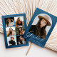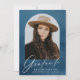 Anúncio de graduação elegante com o dentro de foto do formando de um quadro de arco com fundo de aquarela azul-marinho. "Formando" é exibido em um roteiro branco moderno de caligrafia com o nome do formando, a escola e o ano de formando mostrado abaixo. O anúncio de graduação de fotos é revertido para exibir 6 fotos em um layout no estilo grade.