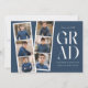 Anúncios de graduação em tendências apresentando uma fita com 6 fotos quadradas do formando. O "Formando" é apresentado em caracteres brancos modernos, com um fundo azul marinho (cor editável). Personalize a frente do anúncio de formatura multifoto, adicionando o nome do formando, o nome da escola e o ano de formatura. O lançamento é revertido para exibir texto adicional, como detalhes de graduação, planos futuros, informações sobre o partido, etc. O anúncio da graduação em na moda é perfeito para formandos de segundo grau e faculdade.