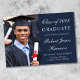 Anúncio simples e moderno do formandos azul escuro com uma foto do formando, seu nome e ano de aula em um roteiro elegante e sua universidade, major e honra em tipografia branca.