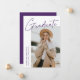 Cartão de anúncio de graduação moderno com uma das fotos do formando na frente com "Formando" em um roteiro escrito à mão roxo com fundo branco. Personalize com o nome do formando, o nome da escola e o ano de graduação. O anúncio de graduação minimalista reverte para exibir 4 fotos em um layout em grade com os planos futuros do formando ou outro texto personalizado mostrado abaixo. O anúncio da graduação de 5 fotos é perfeito para formandos de segundo grau e de faculdade.