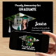 Um anúncio de graduação em preto divertido e único com 6 fotos desenhadas na forma de um boné de formatura na frente e uma foto de solteiro em um quadro de boné de formatura na parte traseira. Personalize-o com seu nome, ano de graduação, escola e quaisquer honras. Todo texto é editável. As fotos podem ser ajustadas com a ferramenta design, se necessário. Todas as cores de texto e fundo podem ser alteradas para corresponder às cores da escola ou ao tema da festa. Se precisar de ajuda com o design ou produtos correspondentes, envie um e-mail para Brandi@photobooksbybrandi.com