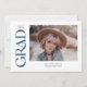 Este anúncio de graduação de na moda apresenta a palavra formando em uma serifa azul de tendência ao longo do lado esquerdo. A frente tem espaço para uma foto do formando assim como seu nome, ano de aula e escola. O verso do anúncio tem espaço para uma segunda foto e uma pequena mensagem.