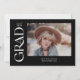 Este anúncio de graduação em na moda apresenta a palavra formando em uma serifa de tendência branca ao longo do lado esquerdo. A frente tem espaço para uma foto do formando assim como seu nome, ano de aula e escola. O verso do anúncio tem espaço para uma segunda foto e uma pequena mensagem.