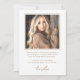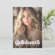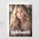 Anúncio branco ou de graduação em cores com uma foto de cheio na frente com uma sobreposição de texto branco "formando" em uma frente de estilo retroativo. Abaixo está um modelo para o nome do formando e o ano ou outro texto personalizado. Mensagem personalizada e foto adicional no verso.