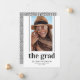 Simples cartão de lançamento de graduação 2025 com um simples fundo branco que pode ser alterado para corresponder a qualquer escola ou cor favorita. O foco principal é no próprio formando - a foto dele tira o palco central, com duas linhas elegantes descendo de cada lado para adicionar um toque de modernidade. O resultado? Uma declaração que gritar "este é o formando!". E é claro, seu nome, escola/faculdade, e ano de aula são apresentados elegantemente, fazer que todos saibam quem é a estrela do show. O padrão negro ousado e geométrico no verso adiciona um toque de sofisticação, sem tirar da frente.