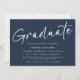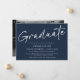 Este é um anúncio de graduação minimalista e simples. Ele usa um design de script moderno e na moda, manuscrito, em azul escuro clássico e branco, com uma foto no verso. Este design aplica um filtro preto e branco à sua foto, para remover ou alterar este, pressione o botão azul para editar o design, selecione a foto e edite as configurações do filtro de acordo. Entre em contato com o designer para obter informações sobre este design.
