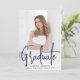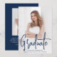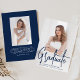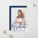 Anúncio de graduação moderno com sua foto vertical na frente com "Formando" exibido em uma camada de script de marinho manuscrita. Personalize a frente do anúncio de graduação de fotos com o nome do formando, o nome da escola e o ano de graduação. O simples anúncio de graduação é revertido para exibir uma foto adicional com espaço fornecido para incluir os planos de formando, detalhes de graduação, etc. O anúncio da graduação de duas fotos é perfeito para segundos graus e formandos!