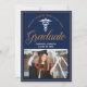 Este anúncio de graduação de marinho de chic, azul e ouro, para uma enfermeira ou um médico apresenta tipografia branca clássica sob um caduceus médico e seu nome de faculdade para a classe de 2025. Personalize com seu ano de graduação com a elegante caligrafia para um cartão de formando universitário personalizado de excelente.