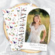 Este elegante anúncio de graduação de fotos em na moda apresenta uma foto vertical em estilo de arco e título em texto de flor silvestre com um nome de script personalizável e texto na frente. A parte traseira apresenta o padrão de flor silvestre. Uma forma excelente de mostrar seu formando. Clique no botão editar para personalizar este design.