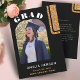 Anúncio de Graduação de Foto do Elegante Black Dourado Glitter Formando. Design moderno com falso brilho dourado em um fundo preto com nome de formando e uma foto em um quadro de arco na frente. Personalize o texto e a foto na frente e o anúncio na parte traseira.