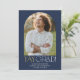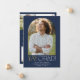 Este moderno cartão de marinho fete e formando de ouro para fotos, feito em cartaz, é o anúncio perfeito de segundo grau simples ou formando universitário. O design apresenta uma elegante tipografia de vassoura com um toque de estilo sofisticado em azul-marinho clássico e ouro amarelo. Personalize a frente do cartão com uma foto, seu nome de formando, escola e ano de aula. Inclua 4 fotos adicionais e uma mensagem de anúncio mais longa na parte traseira do cartão.