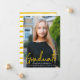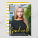 Na moda, anúncio de graduação moderno com a foto vertical do formando com "Formando" em uma fonte amarela de script de pincel. Personalize o anúncio de graduação de fotos adicionando o nome do formando, o nome da escola e o ano de graduação. O anúncio da graduação da tendência reverte para exibir um padrão listrado amarelo e branco.