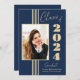 Este anúncio elegante de graduação em na moda de 2024 apresenta listras douradas, quadro fotográfico e texto em fundo azul marinho.