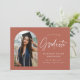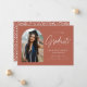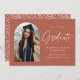 Anúncio de graduação da Tendy com a foto do formando moldada por um arco de cor argila com "Formando" em um roteiro manuscrito branco. Personalize a frente do cartão de anúncio de graduação em março adicionando o nome do formando, o ano de graduação, o nome da escola e os planos futuros. O anúncio de graduação de fotos é revertido para exibir um padrão pontilhado vermelho e branco. O anúncio é adequado para formandos de segundo grau e de faculdade.