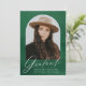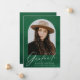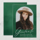 Anúncio de graduação elegante com o dentro de foto do formando de um quadro de arco com fundo de aquarela verde. "Formando" é exibido em um roteiro branco moderno de caligrafia com o nome do formando, a escola e o ano de formando mostrado abaixo. O anúncio de graduação de fotos reverte para exibir um plano de fundo de aquarela verde correspondente com espaço para texto e fotos adicionais.