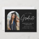 Anúncio de graduação da Tendy com a foto do formando moldada por um arco preto com "Formando" em um roteiro manuscrito branco. Personalize a frente do cartão de anúncio de graduação em março adicionando o nome do formando, o ano de graduação, o nome da escola e os planos futuros. O anúncio de graduação de fotos é revertido para exibir um padrão pontilhado preto e branco. O anúncio é adequado para formandos de segundo grau e de faculdade.