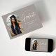 Anúncio de graduação da Tendy com a foto do formando enquadrada por um arco verde com "Formando" em um roteiro manuscrito branco. Personalize a frente do cartão de anúncio de graduação em março adicionando o nome do formando, o ano de graduação, o nome da escola e os planos futuros. O anúncio de graduação de fotos é revertido para exibir um padrão pontilhado em cinza/bege e branco. O anúncio é adequado para formandos de segundo grau e de faculdade.