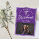 Este anúncio de formatura de uma faculdade de medicina roxa para uma enfermeira ou um médico apresenta tipografia branca clássica sob um caduceus médico e seu nome de faculdade para a classe de 2025. Personalize com seu ano de graduação com a elegante caligrafia para um cartão de formando universitário personalizado de excelente.