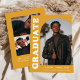 Anúncio de graduação de na moda e tendência apresentando a foto do formando na frente com um quadro de fotos de arco de offset. O "Formando" é apresentado em caracteres brancos retrorreflectores a negrito num fundo amarelo-alaranjado. Personalize a frente do anúncio de graduação em fotos de arco adicionando o nome do formando, a escola e o ano de graduação. O cartão se reverte para exibir 3 fotos adicionais com espaço para texto personalizado, como futuros planos de faculdade, planos de carreira, detalhes de festa de formatura, etc. O anúncio de graduação em laranja-amarelo é perfeito para formandos de segundo grau e de faculdade.