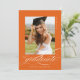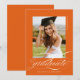 Orange Modern Elegant Script Black White Graduation Announsement apresenta um belo e elegante roteiro, juntamente com os detalhes do seu partido e a sua foto de cheio no verso.
