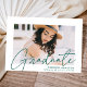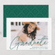 Comemore o formando com nosso anúncio de graduação em na moda. O anúncio de graduação exibe a foto do formando com "Formando" em uma cobertura verde moderna de roteiro de caligrafia. Personalize a frente do anúncio de graduação moderno adicionando o nome do formando, o nome da escola e o ano de graduação. O anúncio inverte para apresentar um padrão geométrico verde e branco pontilhado. O design é perfeito para segundos graus e formandos universitários.