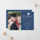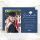 Envie a sua família e amigos um cartão personalizado único de graduação de fotos, com sua foto personalizada à esquerda e à direita, um boné branco com a palavra "Formando", classe/ano, nome e outros detalhes da cerimônia na caligrafia formal de script branco para personalizar em um fundo azul. Desenhada por Susan Coffey.