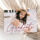 Comemore o formando com nosso anúncio de graduação em na moda. O anúncio da graduação exibe a foto do formando com "Formando" em uma cobertura de rodada moderna de caligrafia. Personalize a frente do anúncio de graduação moderno adicionando o nome do formando, o nome da escola e o ano de graduação. O anúncio inverte-se para apresentar um padrão geométrico giro e pontilhado branco. O design é perfeito para segundos graus e formandos universitários.