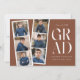 Anúncios de graduação em tendências apresentando uma fita com 6 fotos quadradas do formando. "Formando" é apresentado em caracteres brancos modernos, com fundo castanho (cor editável). Personalize a frente do anúncio de formatura multifoto, adicionando o nome do formando, o nome da escola e o ano de formatura. O lançamento é revertido para exibir texto adicional, como detalhes de graduação, planos futuros, informações sobre o partido, etc. O anúncio da graduação em na moda é perfeito para formandos de segundo grau e faculdade.