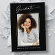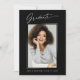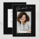 Cartões modernos, elegantes e modernos, com design de elementos do texto moderno com escrita de tinta de caligrafia. A foto do formando na frente da placa é realçada com uma delicada e minimalista placa de gradiente. A parte traseira do cartão oferece espaços de texto personalizados para informações sobre a sua graduação ou pode ser apagada se você quiser enviar uma mensagem. Preto e branco ou personalize facilmente o fundo para corresponder à cor primária da sua escola ou a qualquer cor da sua escolha. Perfeito para o segundo grau, universitário e estudante de formando universitário.