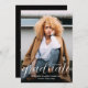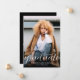 Este anúncio elegante de formatura fotográfica mostra nossa foto na frente junto com seu nome, escola e a palavra formando em letra chic. Altere o texto no verso para seu próprio anúncio ou como convite de festas.