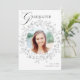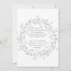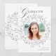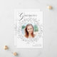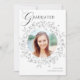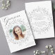 Um elegante cartão de anúncio de graduação com uma coroa de silhuetas de flor silvestre (cinza clara) prateada, com uma foto e uma mensagem no verso.