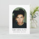 Cartão de lançamento de graduação com quadro fotográfico em forma de arco. O "Formando" aparece na tipografia moderna com o nome do formando e o ano de formando a seguir indicados. O verso do convite contém detalhes de graduação.