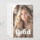 Anúncio branco ou de graduação em cores que apresente o seu quadro de dentro de meia altura em arco com sobreposição de texto branco "formando" em uma frente de estilo retroativo. Alinhado verticalmente à esquerda, há um modelo para o nome do formando e a escola. Mensagem personalizada e foto adicional no verso.