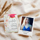 Este adorável anúncio de formatura em flor silvestre diz "formando" em delicada, branca e elegante fonte moderna e tem sua foto pessoal favorita na frente do cartão. O verso pode conter informações adicionais sobre o formando, que será apresentado em um design preto e branco minimalista.