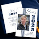 Anúncio de graduação elegante da na moda de 2025 com faixas azuis de marinho, quadro fotográfico e texto em fundo branco.
