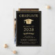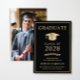 Anúncio de formandos negro elegante com boné de formando de ouro e tipografia moderna de ouro simples e leve para o nome do formando, ano de aula, faculdade ou universidade, grau e grande ou honras. A foto do formando preenche a parte traseira da placa.